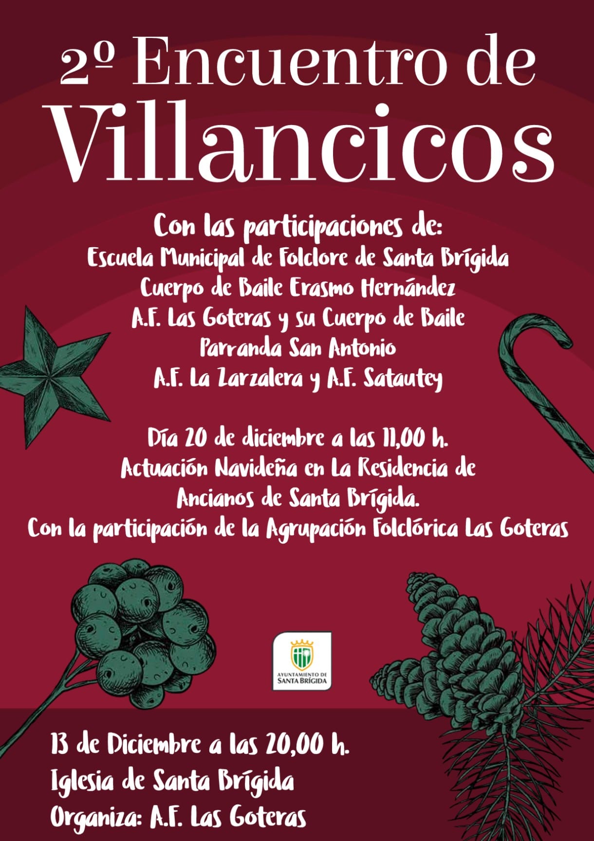 El viernes, 13 de diciembre, a las 20:00 h, la Iglesia de Santa Brígida acoge el 2º Encuentro de Villancicos, un emotivo acto navideño organizado por la Agrupación Folclórica Las Goteras, que reunirá a una amplia representación del folclore local: la Escuela Municipal de Folclore, el Cuerpo de Baile Erasmo Hernández, la A.F. Las Goteras con su cuerpo de baile, la Parranda de San Antonio, la A.F. La Zarzalera y la A.F. Satautey.