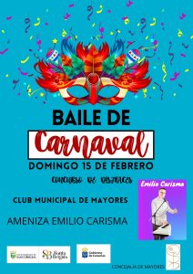 El Club municipal de mayores celebra el próximo domingo 15 de febrero un «BAILE DE CARNAVAL «, en sus instalaciones, en horario de 17:00 a 21:00 horas, gratuito, amenizado por «EMILIO CARISMA «, actividad dirigida principalmente para soci@s , pero se permite la entrada al público en general hasta completar aforo.