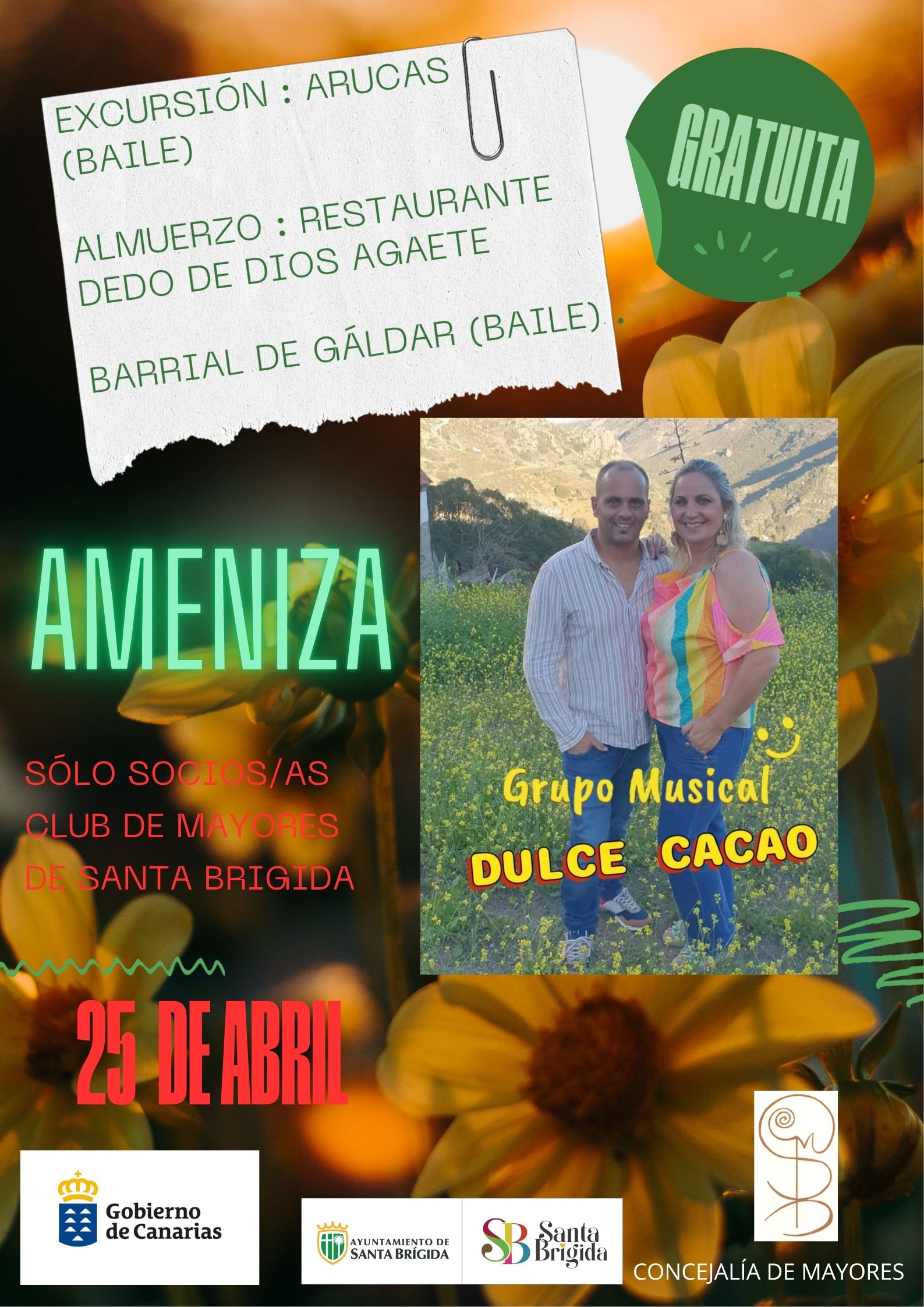 Club de MayoresEl Club Municipal de mayores, organiza para el próximo sábado 25 de Abril una excursión , cuyo recorrido es el siguiente: Santa Brígida-Arucas (Baile)-Agaete(Restaurante Dedo de Dios) - Barrial de ... Leer más