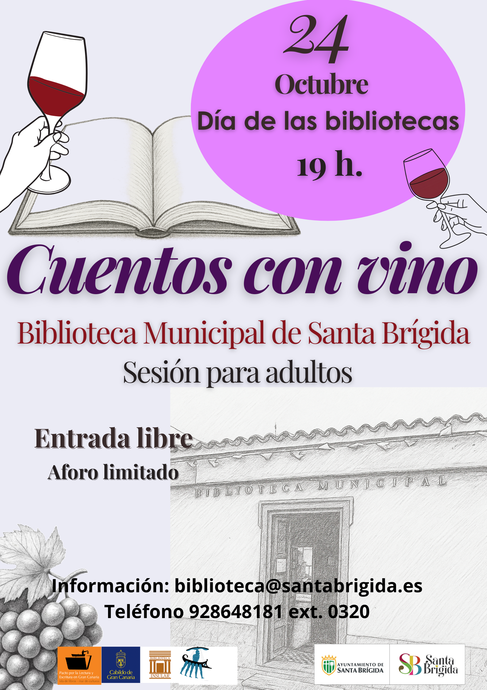 Con motivo del Día de las Bibliotecas, la Biblioteca Municipal de Santa Brígida celebra el próximo 24 de octubre, a las 19:00 horas, una sesión especial titulada Cuentos con vino, una propuesta pensada para el público adulto que une literatura, narración oral y el placer de compartir un buen vino.
