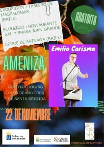 El Club Municipal de mayores,  organiza para el próximo sábado 22 de noviembre una excursión , cuyo recorrido es el siguiente: Santa Brígida-Tablero de Maspalomas-Almuerzo en Juan Grande (Restaurante Sal y Brasa) -Cruce de Arinaga (Baile)  y regreso.