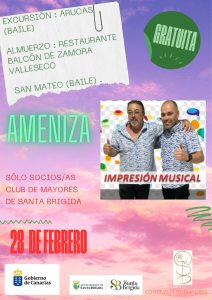 El Club Municipal de mayores, organiza para el próximo sábado 28 de febrero una excursión , cuyo recorrido es el siguiente: Santa Brígida-Arucas-Valleseco-Almuerzo (Restaurante Balcón de Zamora) -San Mateo (Baile) y regreso.