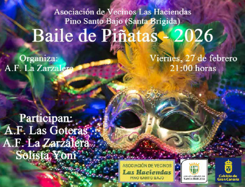 El viernes 27 de febrero, a las 21:00 horas, Pino Santo Bajo acogerá el tradicional Baile de Piñatas, una celebración carnavalesca de antaño que recupera el espíritu de convivencia y diversión vecinal.