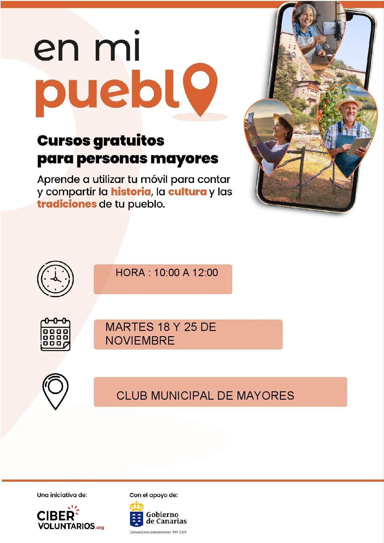 El Club de Mayores organiza un interesante y novedoso proyecto, » En mi pueblo» , gracias a CIBERVOLUNTARIOS, con el apoyo del GOBIERNO DE CANARIAS, un curso donde los mayores aprenderán a utilizar su móvil para contar y compartir la historia, la cultura y las tradiciones de su pueblo, SANTA BRÍGIDA.