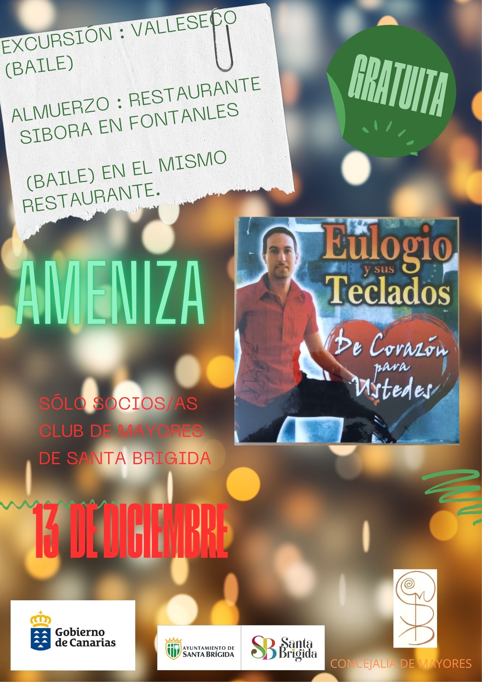 CLUB MUNICIPAL DE MAYORESDE LA VILLA DE SANTA BRIGIDA C. Mirador de la Villa s/n, Santa Brígida, Las Palmas, EspañaEl Club Municipal de mayores, organiza para el próximo sábado 13 de diciembre una excursión , cuyo recorrido es el siguiente: Santa Brígida-Valleseco-Fontanales-Almuerzo y baile (Restaurante Sibora) y regreso. La excursión estará amenizada por el grupo "EULOGIO Y SUS TECLADOS". Las guaguas saldrán de los barrios: 8:20 desde la Atalaya y 8:00 desde el Llano ... Leer más
